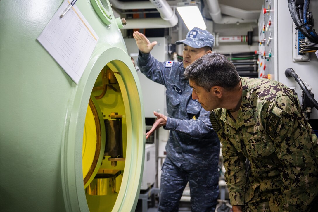 JINHAE NAVAL BASE, Republic of Korea (April 7, 2025) Rear Adm. Todd F. Cimicata, commander, Logistics Group Western Pacific/Task Force 73 (COMLOG WESTPAC/CTF-73), views a hyperbaric chamber by Republic of Korea (ROK) Navy Cmdr. Dong Sakong, the commanding officer of the Tongyeong-class salvage and rescue ship ROKS Gwangyang (ATS-32), during a joint dive and salvage exercise at Jinhae Naval Base, Republic of Korea, April 7, 2025. COMLOG WESTPAC/CTF-73 sustains the U.S. Navy’s maritime forces and is responsible for all diving and salvage operations in the Western Pacific in support of a free and open Indo-Pacific. (U.S. Navy photo by Mass Communication Specialist 2nd Class Jordan Jennings)