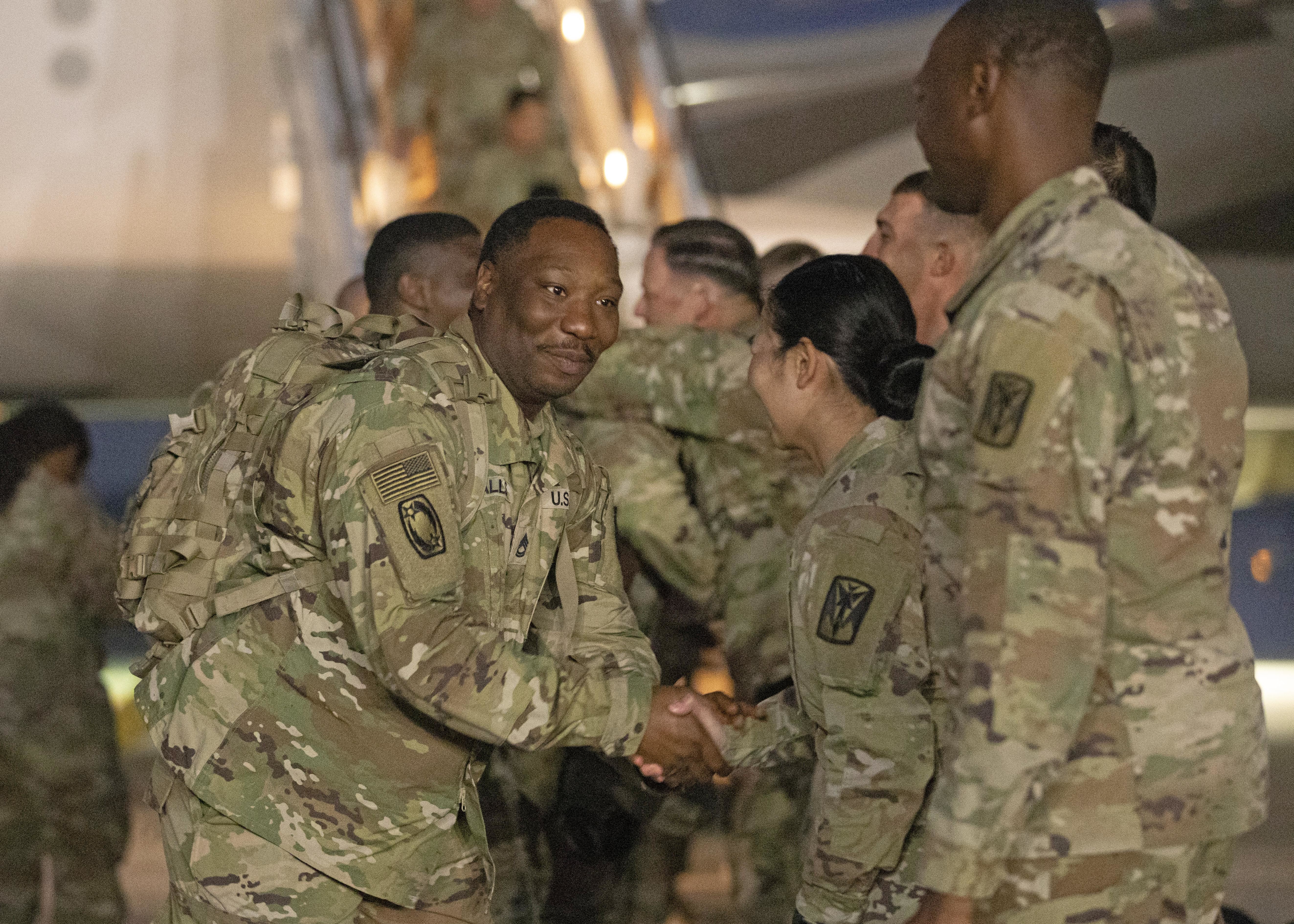 Soldiers of 2nd Battalion, 1st Air Defense Artillery Regiment, 35th Air Defense Artillery Brigade are greeted by Eighth Army and 35th ADA leaders as they deplane at Osan Air Base, South Korea, Oct. 30, 2025. The 2-1 ADA Battalion departed the Korean peninsula in March on short-notice orders to provide critical air and missile defense for key U.S. and coalition assets in the U.S. Central Command area of responsibility.