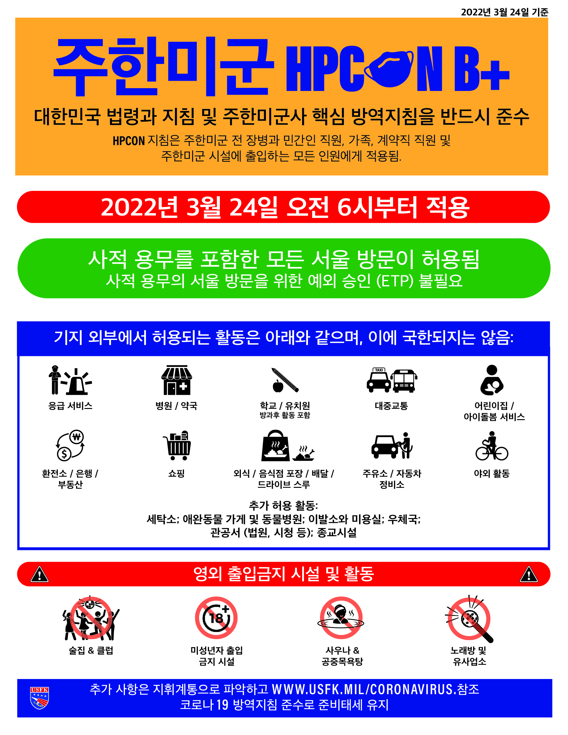 USFK adjusted its Health Protection Condition Bravo Plus mitigation measures to align with existing Republic of Korea policies and have lifted all travel restrictions to Seoul, beginning Thursday, March 24 at 6 a.m. until Thursday, April 21 at 6 a.m.