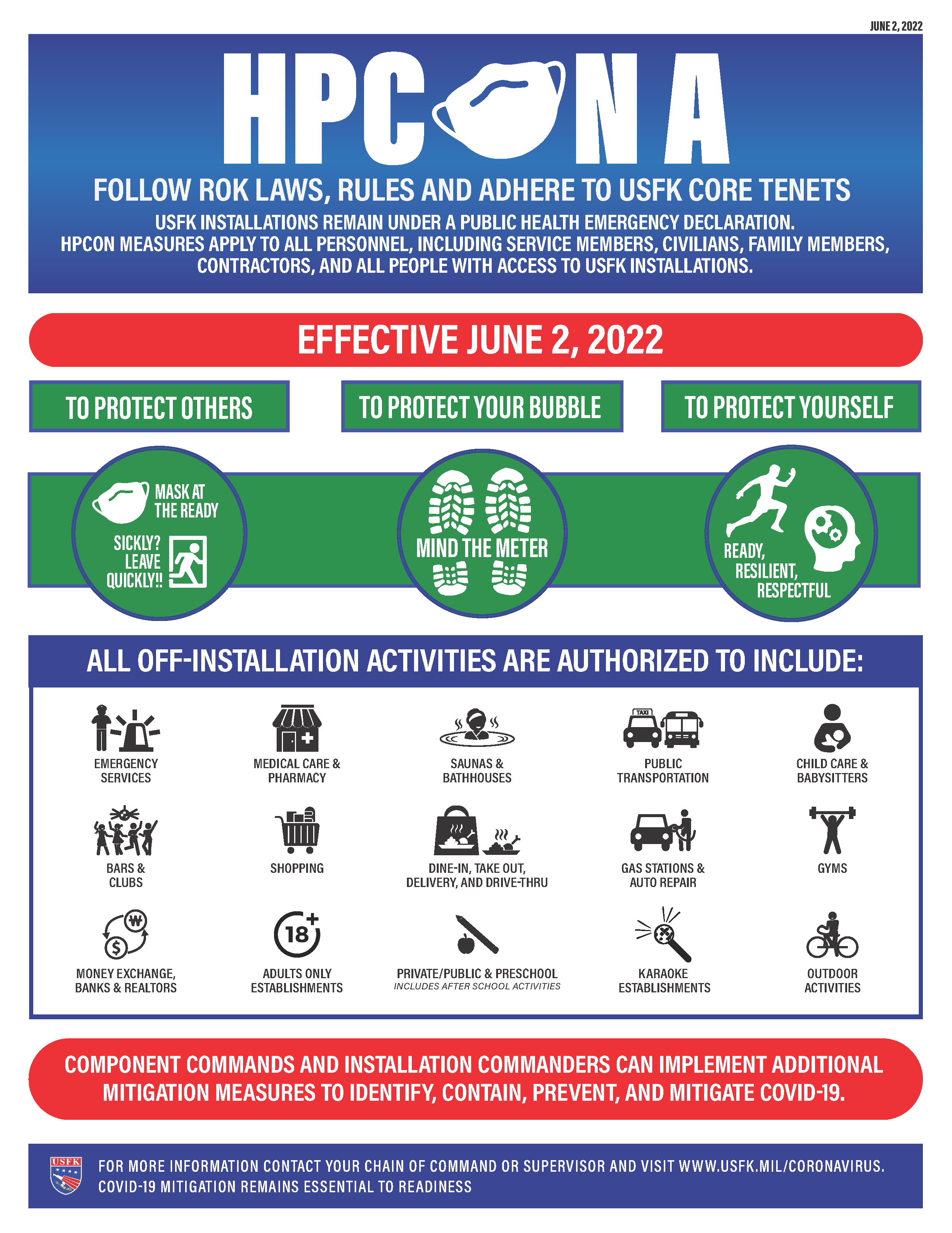 All USFK-affiliated individuals are reminded to adhere to USFK’s core tenets, HPCON Alpha mitigation measures and all South Korean rules, directives and laws to protect yourself, your family and our community from COVID-19.